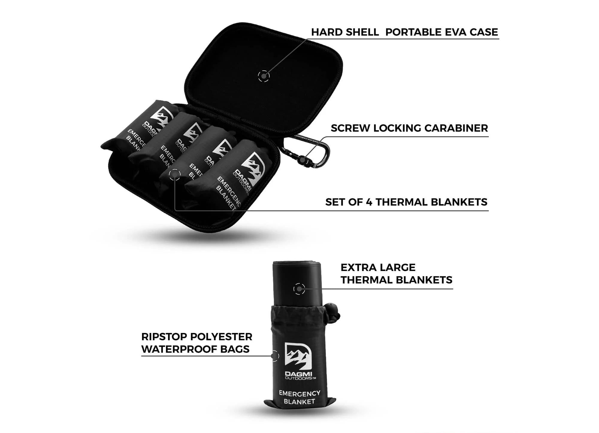 This compact waterproof case is comprised of 4 Emergency Blankets that I keep in my car. With a family of four that travels often, I feel comfortable knowing that I have this product. I think any family that has children and travels should keep this in their car. You never know what the world will throw at you and, in an emergency, you may need these blankets. Using and owning other Dagmi Outdoor products, I know they stand behind their brand.
