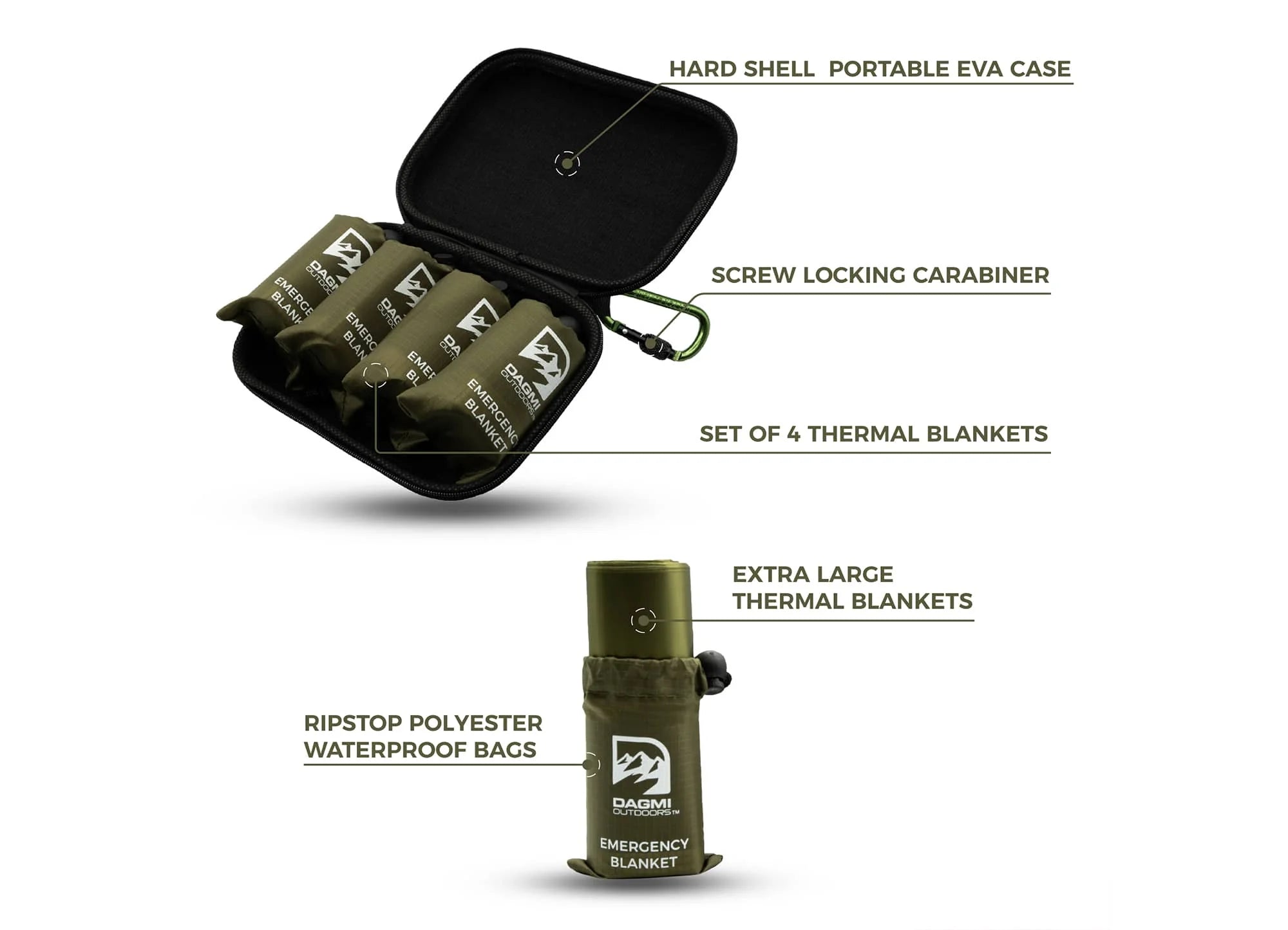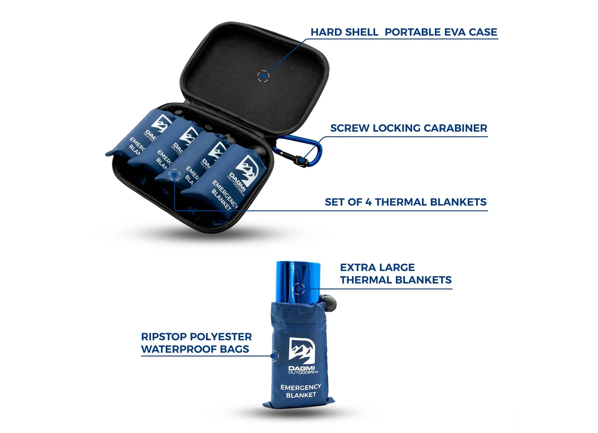 This compact waterproof case is comprised of 4 Emergency Blankets that I keep in my car. With a family of four that travels often, I feel comfortable knowing that I have this product. I think any family that has children and travels should keep this in their car. You never know what the world will throw at you and, in an emergency, you may need these blankets. Using and owning other Dagmi Outdoor products, I know they stand behind their brand.